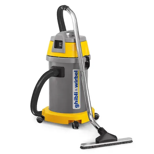 Aspirador Pó e Líquidos AS 27 P – Ghibli de média dimensão com 1 motor de grande potência. Equipado com filtro de poliéster. Saco de papel, filtro de nylon e filtro de cartucho HEPA opcionais. Acessório de carpetes e dispositivo anti-espuma, também opcionais.